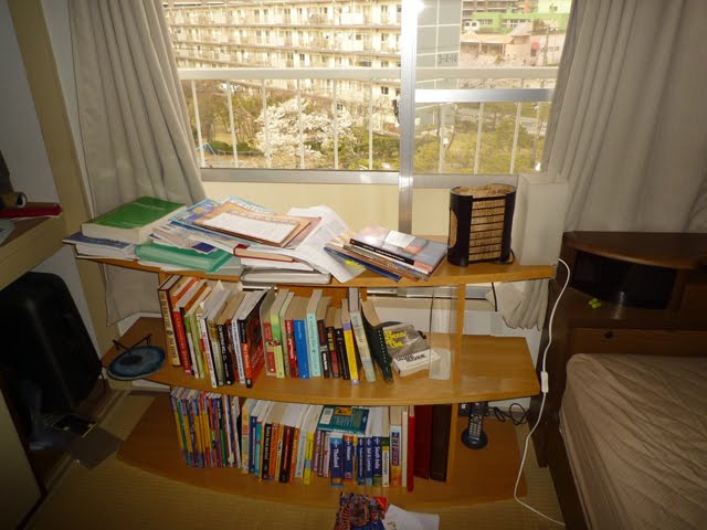 First a quick glance into my back storage room when I got in. I had the bookshelf attached to the wall (standard earthquake-prep in Japan). But I guess it didn't work as it looks like an angry poltergeist went to town on my books.